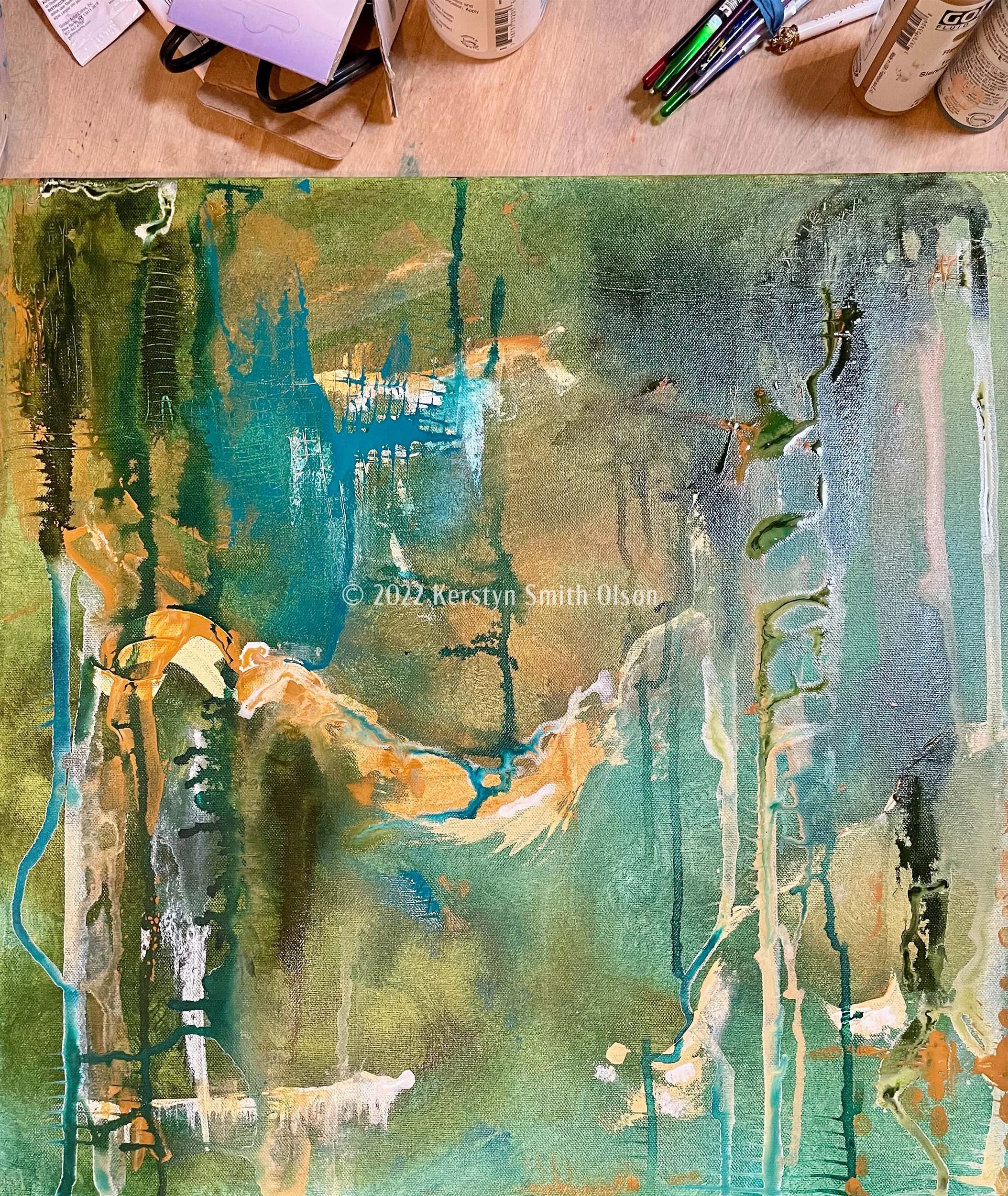 Intuitively discovered, this acrylic on canvas is a coming together of color, texture, and emotion.